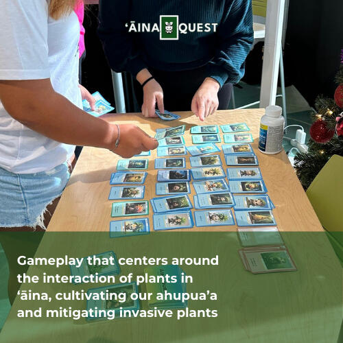 ʻĀinaQuest is a physical and soon digital card game dedicated to revitalizing the relationship between people and plants. The objective is to collect native plants and have the least invasive plants at the end.